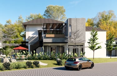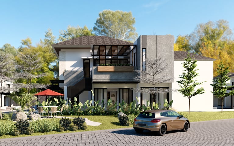 Menampilkan desain eksterior rumah modern dengan sentuhan minimalis yang elegan. Detail seperti tangga dengan desain kontemporer dan area duduk di luar ruangan yang teduh menambah kesan fungsional sekaligus estetik. Solusi desain kami menyatu dengan alam, menciptakan hunian yang indah, nyaman, dan selaras dengan lingkungan sekitar. Wujudkan impian hunian Anda bersama kami, tempat di mana keindahan dan kenyamanan berpadu.