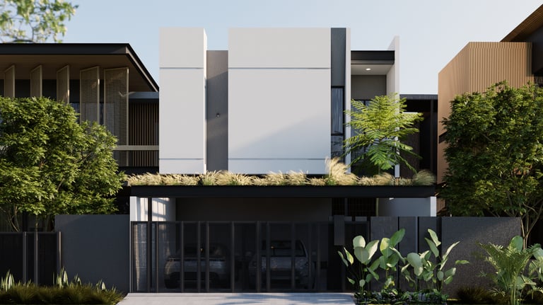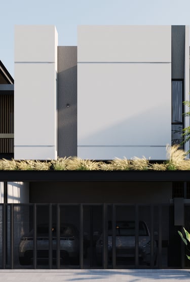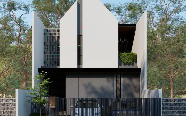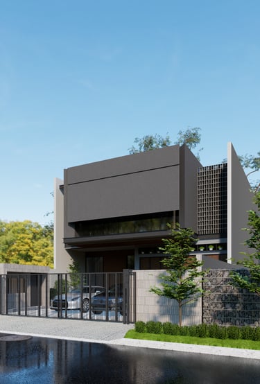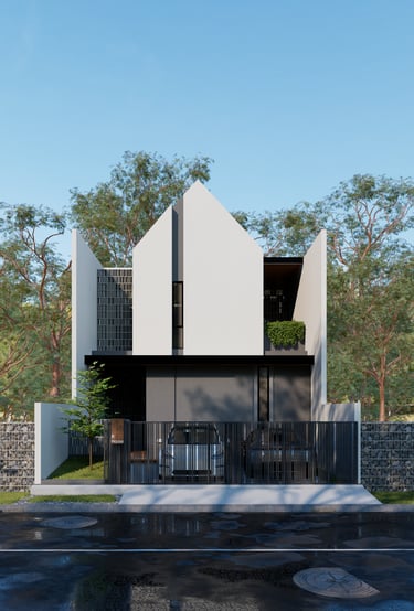 Menampilkan desain rumah modern dengan bentuk geometris yang tegas dan penggunaan warna monokrom yang elegan. Struktur bangunan yang dinamis, dengan atap tinggi dan garis vertikal, memberikan kesan megah sekaligus minimalis. Sentuhan hijau pada balkon menambah keseimbangan antara estetika modern dan elemen alami. Rumah ini dirancang untuk mencerminkan kepribadian yang kuat dan fungsionalitas yang tinggi.