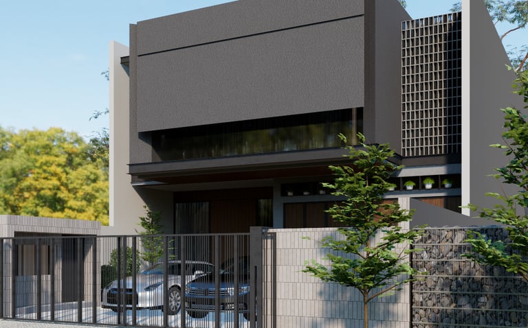 Menampilkan desain rumah modern dengan konsep "Floating House," di mana bangunan tampak melayang dengan penggunaan elemen garis horizontal yang tegas dan fasad minimalis. Struktur yang tampak kokoh dan elegan ini menggabungkan material modern dengan detail arsitektur yang bersih, menciptakan kesan futuristik dan mewah. Desain pagar yang ramping serta penggunaan material gelap menambah kesan eksklusif, menjadikan rumah ini simbol dari gaya hidup kontemporer yang canggih.